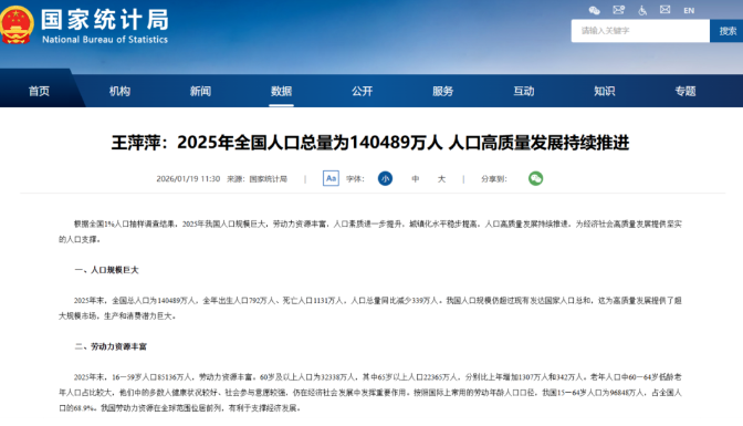 1月19日,国家统计局发表题为“2025年全国人口总量为14...